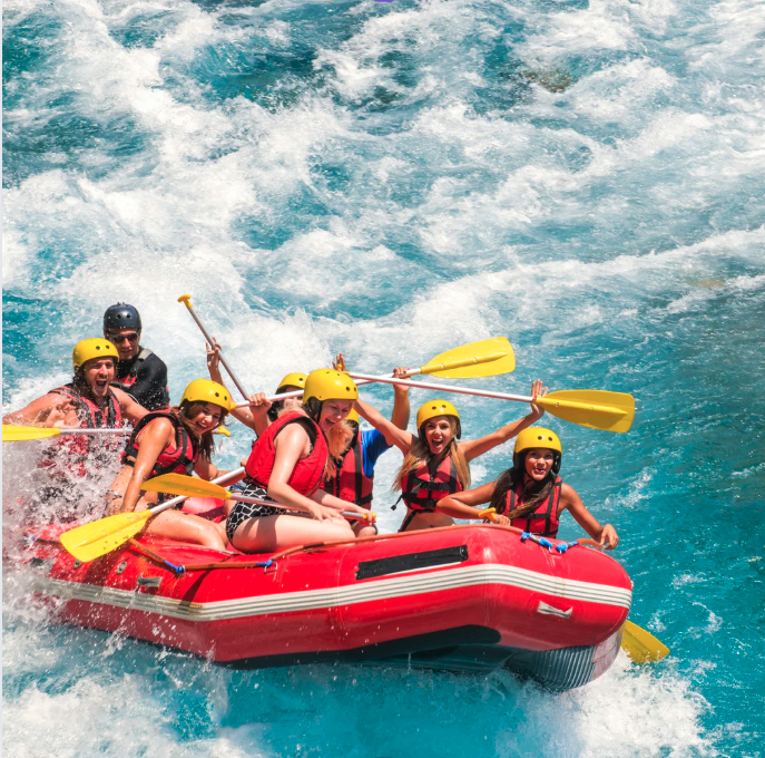 Group of people white-water rafting in a red inflatable raft with yellow paddles, wearing yellow helmets and life jackets, on a river with turbulent water.